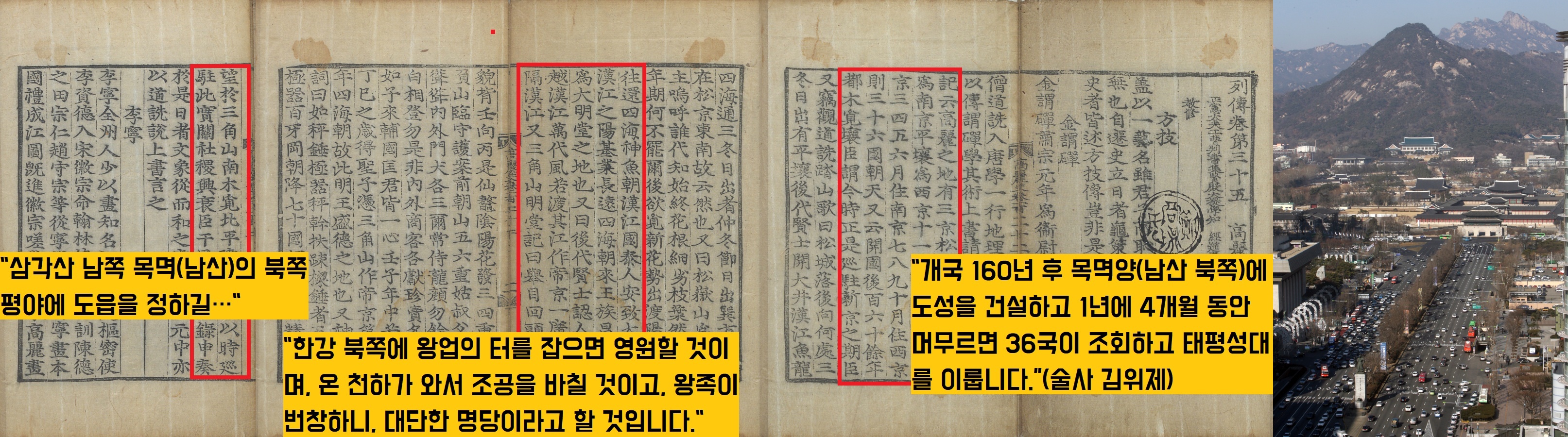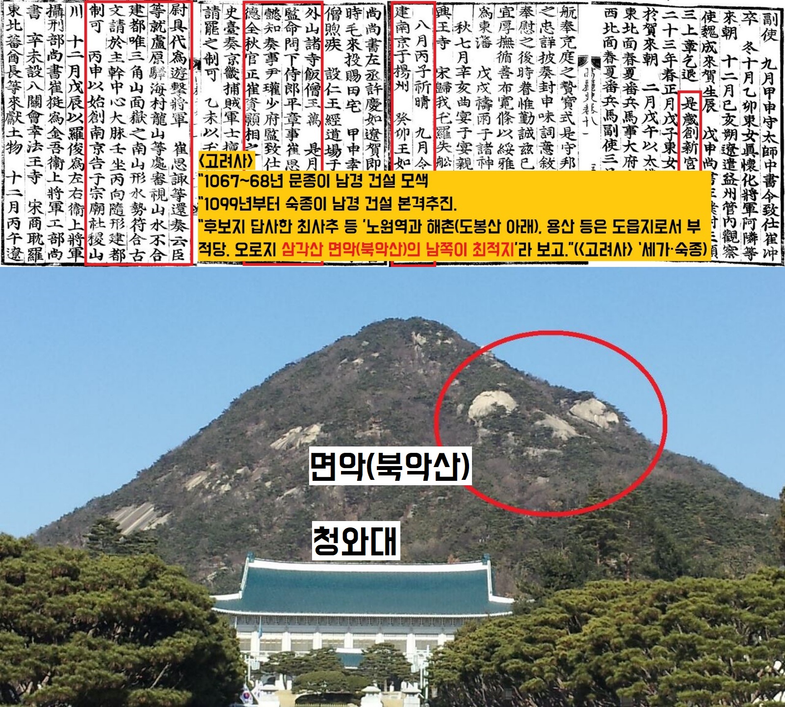 “노원역과 해촌(도봉산 아래), 용산 등에 가서 산수를 살펴보았지만 도읍을 세우기에는 적당하지 않았습니다. 오로지 삼각산(북한산) 면악(북악산)의 남쪽이 산의 모양과 물의 형세가 옛 문헌에 부합합니다.”(<고려사> ‘세가·숙종)