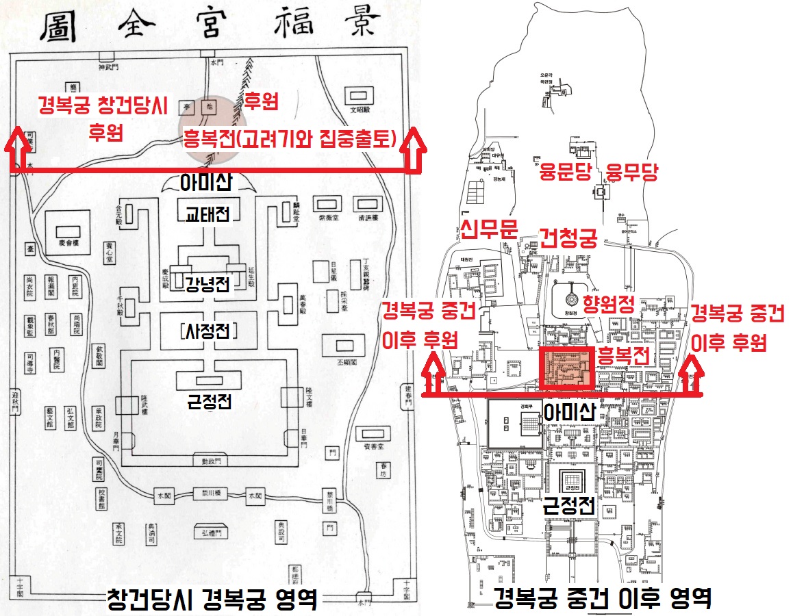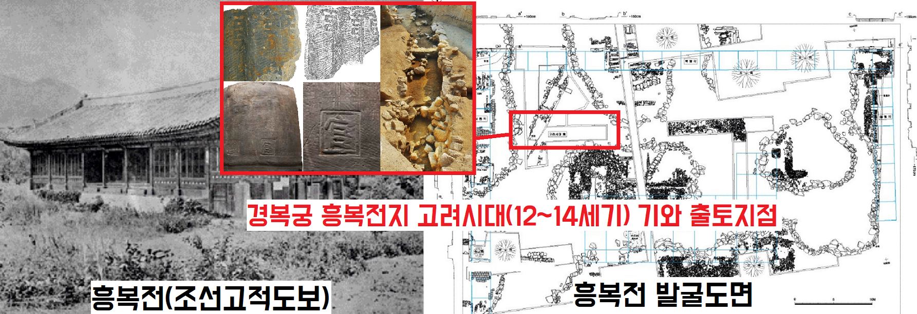고려기와가 출토된 흥복전(외국사신 접대 공간)이 경복궁 중건 당시, 즉 1865~68년에 조성된 전각이다.