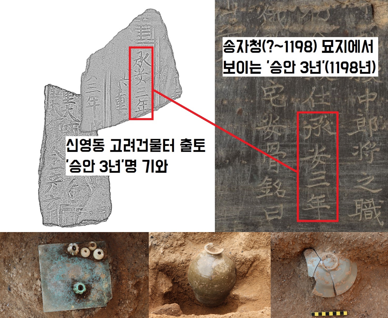 무엇보다 유적의 연대를 판단할 수 있는 명문 기와(‘승안 3년·承安三年)가 출토됐다. ‘승안’은 금나라 장종(1189~1208)의 연호(1196~1200)이다. ‘승안 3년’은 1198년(고려 신종 원년)을 가리킨다. 발굴단(수도문물연구원)은 이 건물터의 위상이 심상치않다고 본다. 대체로 고려 왕실과 관련된 특수건물인 것으로 추정하고 있다.