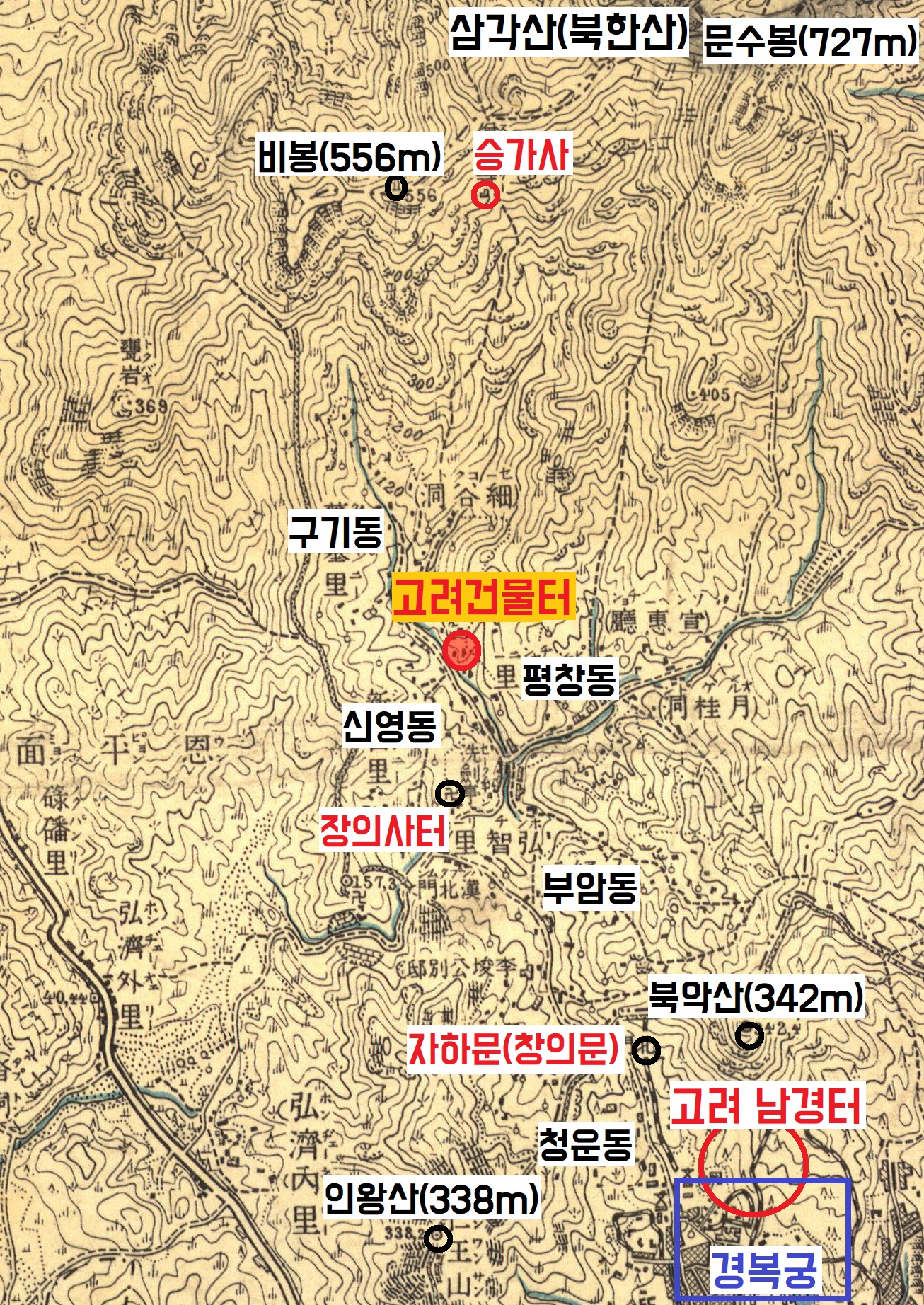 장의사-발굴지역-승가사 쪽에서 남쪽으로 내려가 자하문(창의문) 고개를 넘어서면 청와대와 경복궁에 닿는다.