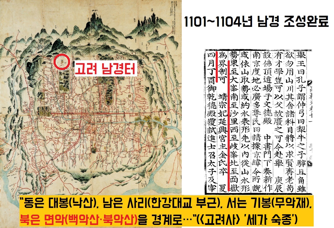 이듬해인 1102년(숙종 7) 중서문하성이 ‘동으로는 대봉(낙산), 남으로 사리(한강대교 부근), 서로 기봉(무악재), 북으로 면악(북악)을 긋는’ 남경의 도시계획도를 완성했다. 약 3년간의 공사 끝에 궁궐이 완공됐다.