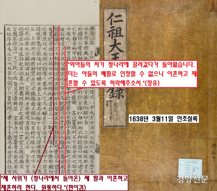 “그러나 이 뒤로 사대부집 자제는 모두 다시 장가를 들고, 다시 (환향녀와) 합하는 자가 없었다”는 겁니다. 이 날짜 실록의 기록자인 사관의 평론도 기가 찹니다.