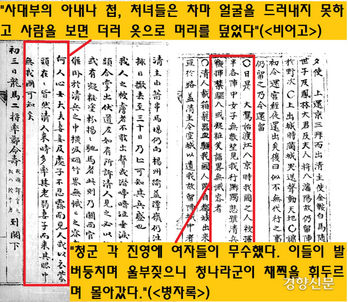 어디 그뿐이겠습니까. 삼전도의 굴욕(1637년 1월30일) 후 청나라로 끌려간 이가 60만명이 넘는다는 기록(<비어고>)이 있습니다. 그중 상당수가 여인들이었죠. <병자록>은 “철수하는 청군 각 진영에 여자들이 무수했다. 이들이 발버둥치며 울부짖으니 청나라군이 채찍을 휘두르며 몰아갔다.”고 했습니다. <비어고>는 “사대부의 아내나 첩, 처녀들은 차마 얼굴을 드러내지 못하고 사람을 보면 더러 옷으로 머리를 덮었다”고 했습니다.
