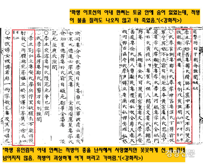 그뿐이 아닙니다. 배를 탔던 헌납 홍명일의 부인과 어머니, 친척여인 3명은 적병이 엄습하자 어린 자식과 함께 서로 껴안고 물에 빠졌습니다. 어떤 선비의 아내는 “청나라군이 죽은 사람의 옷을 모두 벗긴다니 내가 죽으면 서둘러 화장하라”고 당부한 뒤 자진했습니다. 토굴에 숨어있던 여인은 적병이 불을 질렀는 데도 나오지 않고 그대로 타 죽고 말았고요. 어떤 여인은 청나라군이 총을 난사해 몸의 살이 다 뜯겨나갔지만 꼿꼿하게 선채 넘어지지 않았답니다.