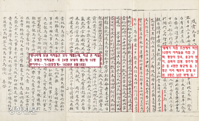 그 과정에서 “못생겼다”고 투덜댄 모양입니다. 그래서 용골대가 “왜 못생긴 여자들만 보냈냐”고 불같이 화낸 거죠.(<심양일기> 1638년 8월21·9월18일) 이게 무슨 수모입니까. 강제로 이역만리 먼 곳으로 떠난 것도 억울한데 ‘못생겼다’는 타박까지 들어야 했으니 말입니다.
