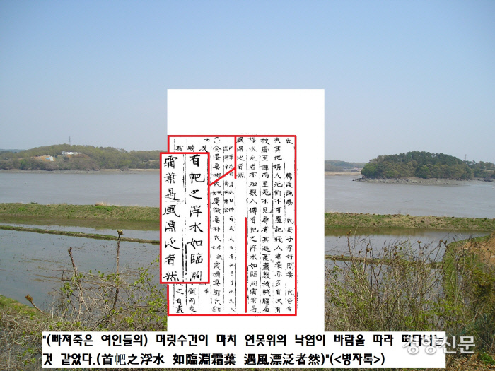 <병자록>과 <비어고> 등은 “바위나 숲에 숨었다가 적에게 핍박을 당해 물에 떨어져 죽은 자들이 얼마나 되는 지 알 수 없다”면서 “(빠져죽은 여인들의) 머릿수건이 마치 연못위의 낙엽이 바람을 따라 떠다니는 것 같았다”고 묘사했습니다. 머릿수건이 연못위 낙엽처럼 바람을 따라 둥둥 떠있었다니 참….