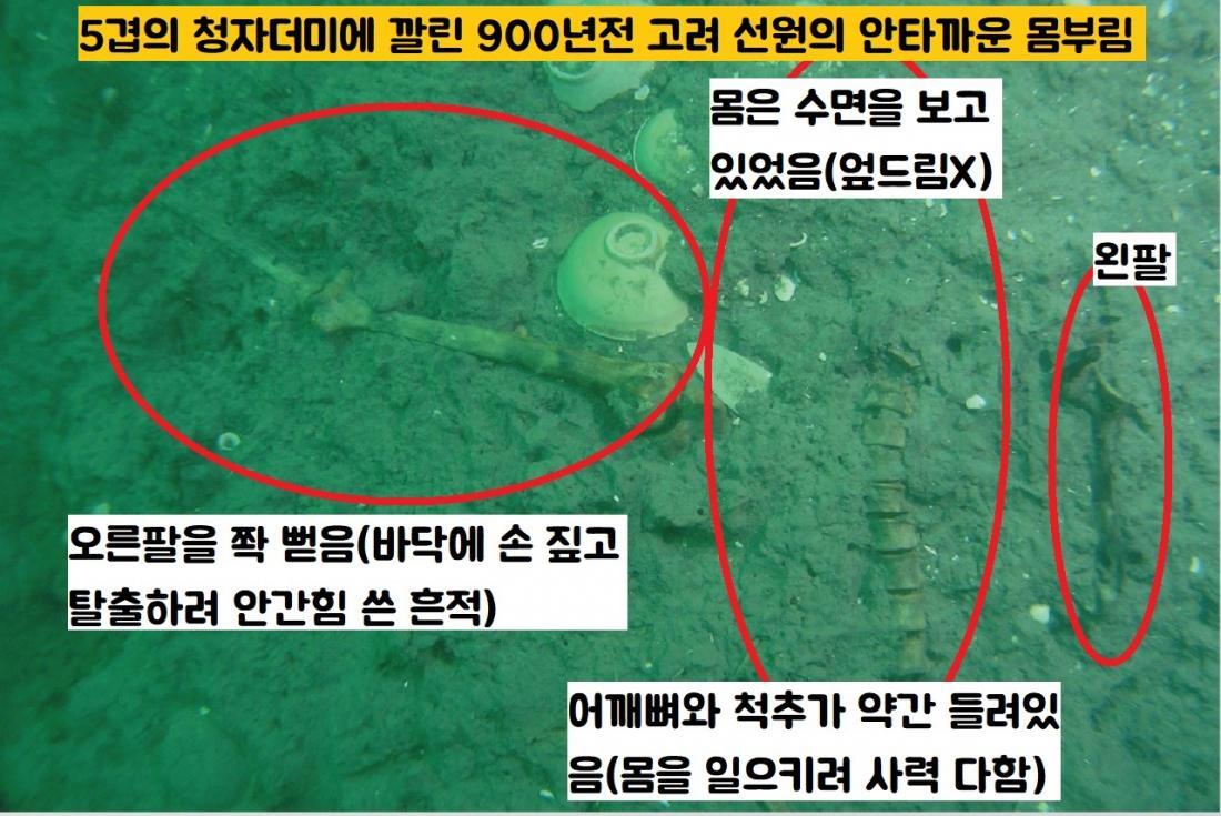 무슨 뜻일까. 배가 갑자기 침몰하자 선원은 5겹으로 선적되어 있던 도자기에 깔렸고, 탈출을 위해 왼쪽으로 비틀어 상반신을 일으키려고 몸부림을 쳤을 것이다. 그러나 그의 안타까운 사투는 침몰하는 배와 함께 물거품이 되었다.