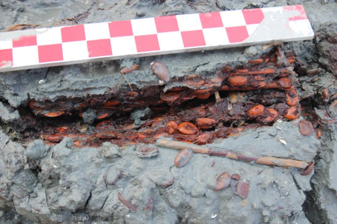 6월26일이었다. 갯벌에 박힌 선체를 인양하려고 배의 바닥판을 들어올릴 때 ‘붉은 색’의 유물이 모습을 드러냈다.