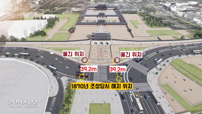 그런데 이것이 원 위치가 아닙니다. 국립서울문화재연구소가 1906~1907년 독일인 헤르만 산더(1868~1945)가 찍은 광화문 사진과, 그간의 월대 발굴결과 등을 토대로 디지털 이미지 분석이라는 첨단기법으로 측정했는데요.