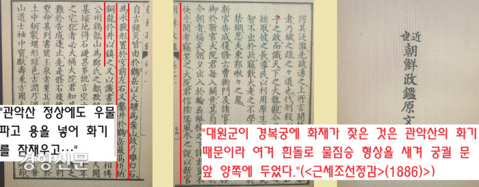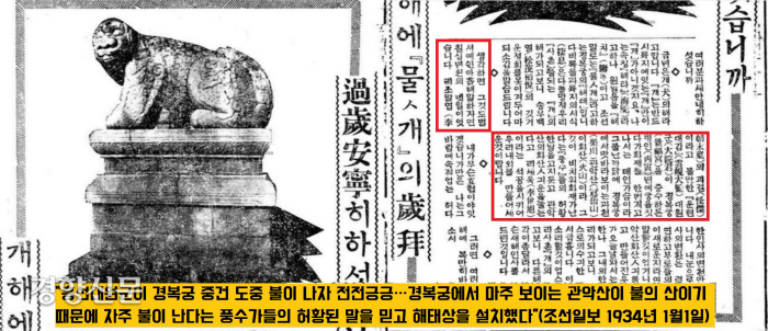 조선일보 1934년 1월1일자는 “흥선대원군이 경복궁 중건 도중 불이 나자 전전긍긍했는데, 경복궁에서 마주 보이는 관악산이 불의 산이기 때문에 자주 불이 난다는 풍수가들의 허황된 말을 믿고 해태상을 설치했다”고 아주 구체적으로 소개했습니다.