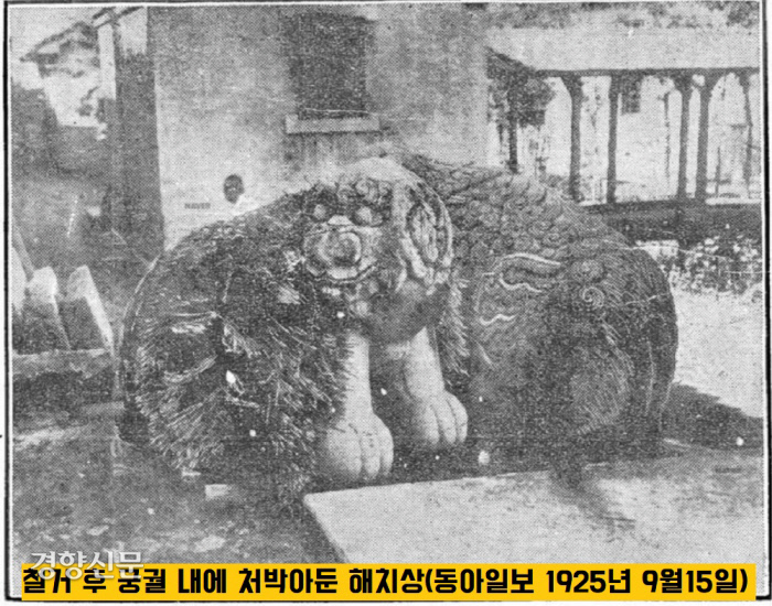 그해 10월4일자 동아일보는 ‘거적에 싸여 방치된 해치상’을 비감어린 어조로 고발했습니다.