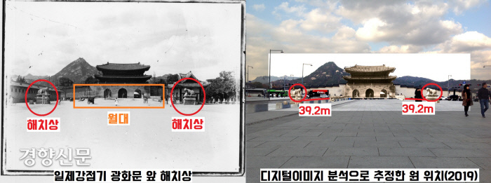 그런데 이것이 원 위치가 아닙니다. 국립서울문화재연구소가 1906~1907년 독일인 헤르만 산더(1868~1945)가 찍은 광화문 사진과, 그간의 월대 발굴결과 등을 토대로 디지털 이미지 분석이라는 첨단기법으로 측정했는데요.