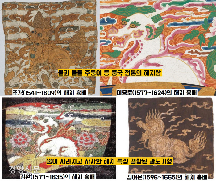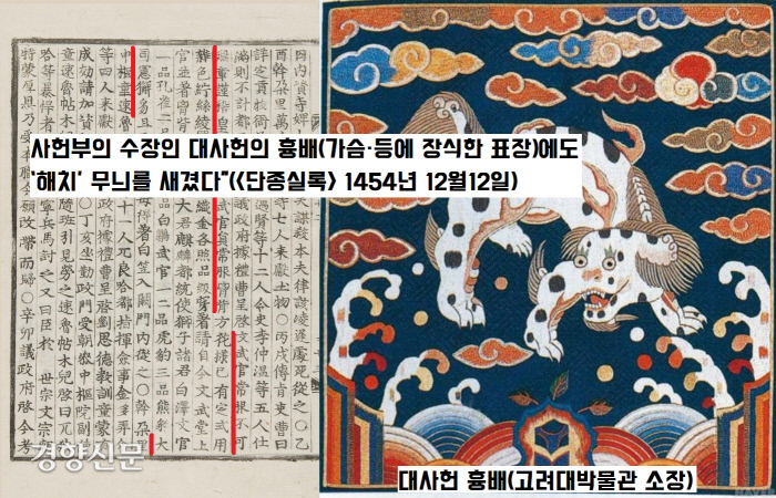 그 외교문서에 “어사대부(대사헌)와 중승(집의·종3품) 등 어사대(사헌부) 관리들은 모두 해치관을 쓴다”고 했다는 군요.(<세종실록> 1426년 2월26일자) 비단 해치관 뿐이 아니었답니다. “사헌부의 수장인 대사헌의 흉배(가슴·등에 장식한 표장)에도 ‘해치’ 무늬를 새겼다”(<단종실록> 1454년 12월12일)는 기록이 있습니다.