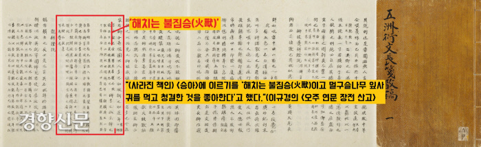 오히려 실학자 이규경(1788~미상)의 <오주 연문 장전 산고>는 “(사라진 책인) <승아>에 이르기를 ‘해치는 불짐승(火獸)이고 멀구슬나무 잎사귀를 먹고 청결한 것을 좋아한다’고 했다”고 전합니다. 해치가 물이 아니라 ‘불의 짐승’이라고 한겁니다.