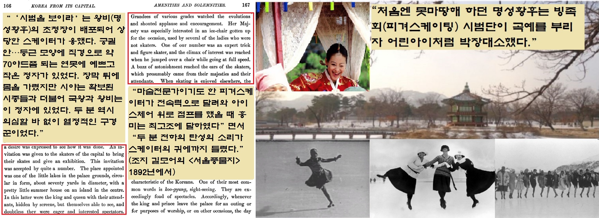 “‘시범을 보이라’는 왕비(명성황후)의 초청장이 배포되어 상당한 스케이터가 응했다. 궁궐 안…둥근 모양에 직경으로 약 70야드쯤 되는 연못에 예쁘고 작은 정자가 있었다. 장막 뒤에 몸을 가렸지만 시야는 확보된 시종들과 더불어 국왕과 왕비는 이 정자에 있었다. 두 분 역시 의심할 바 없이 열정적인 구경꾼이었다.”(<서울풍물지>·1892년)