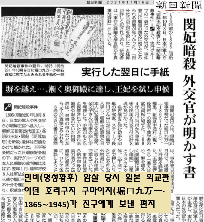 이번에는 아주 기분 더러운 소식이었는데요. 일본 아사히(朝日) 신문에 을미사변(명성황후 시해사건·1895년)에 가담한 일본 외교관 호리구치 구마이치(堀口九万一·1865∼1945)가 친구인 다케이시 사다마츠(武石貞松)에게 보낸 편지가 실렸는데요. 그중 명성황후가 시해된 1895년 10월 8일자 편지에서 이렇게 씁니다.