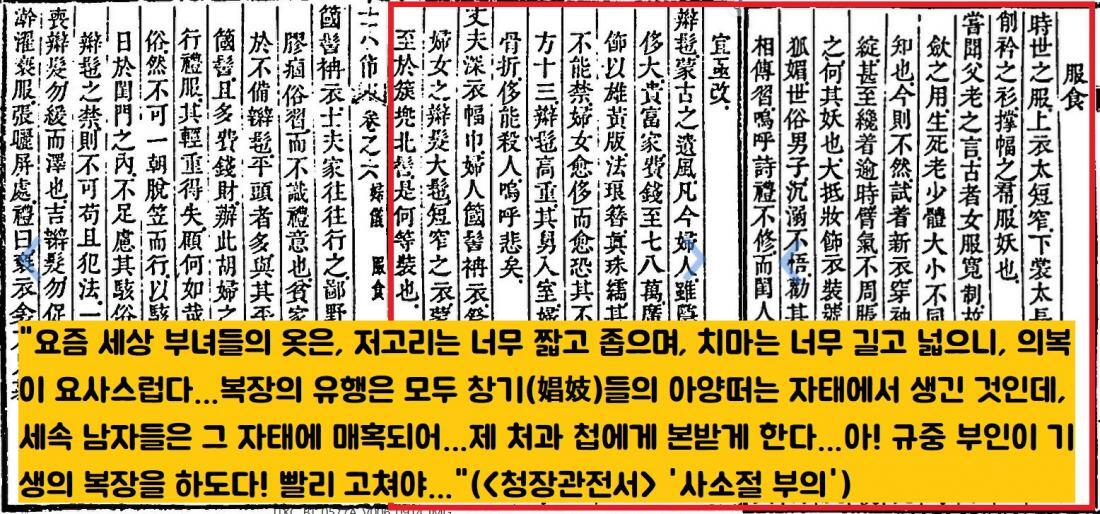“요즘 유행하는 복장은 창기(娼妓)들의 아양떠는 자태에서 생긴 것이다. 그런데 세속 남자들은 그 자태에 매혹되어 그 요사스러움을 깨닫지 못하고 자기의 처와 첩에게 권해 그것을 본받게 한다.”