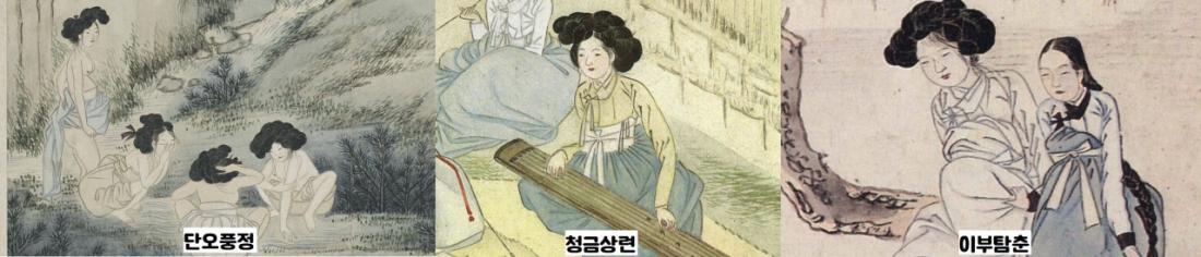 하지만 몸을 조금이라도 움직이면 어떨까. 몸을 가려줄 장치가 금방 사라져버린다. 하다못해 치맛자락을 앞으로 가져와 가슴 앞에다 대어 벌어진 가슴을 가리고자 했다. 어떤 여인들의 속옷은 아예(일부러) 치마 밖에 나와있다.