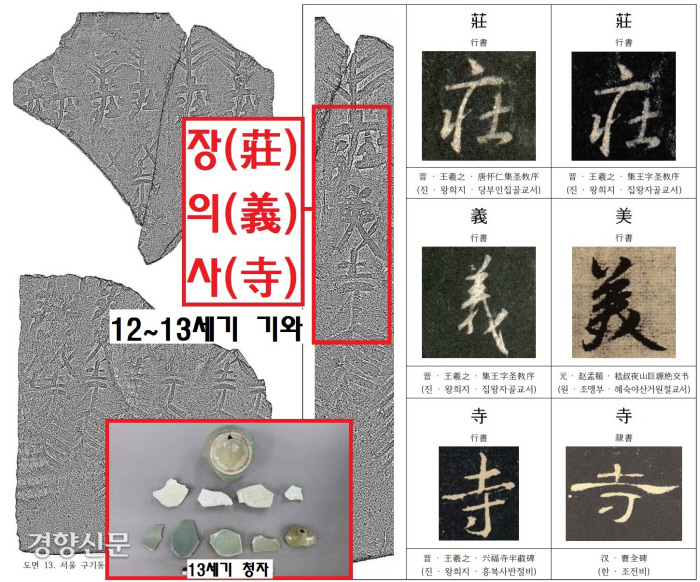 구기동 고려시대 건물터에서 확인된 ‘장의사’명 기와. 이 건물터에서는 12~13세기 기와와 청자편 등이 출토됐다.|수도문물연구원 제공