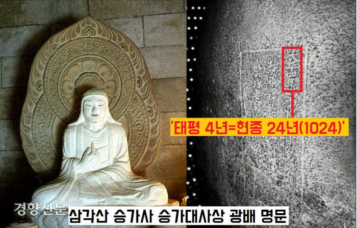 삼각산 승가사 뒷편 석굴에 조성된 등신좌상의 광배에 ‘태평4년’이라는 명문이 새겨져 있다. ‘태평’은 요(거란) 성종의 연호(1021~1031)이니 ‘태평 4년’은 현종 15년(1024년에 해당된다.