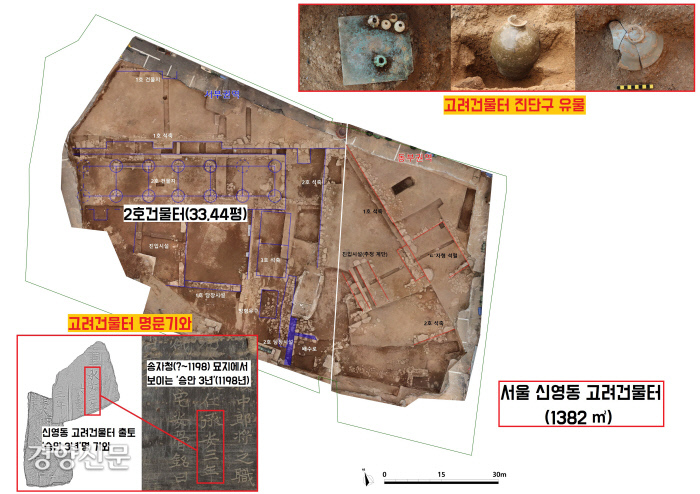 지난 3월 고려시대 건물터가 발견된 곳에서 10m 떨어진 곳에서 확인된 또다른 고려시대 건물터. ‘장의사’ 명 기와와 함께 난방시설도 노출됐다.|수도문물연구원 제공
