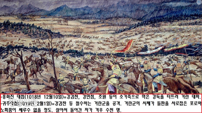 3차 고려-거란 전쟁(1018~1019)에서 두 차례 대첩이 있었다. 첫번째는 소가죽으로 강둑을 막아 터뜨린 흥화진(의주) 대첩이다. 두번째는 철수하는 거란군을 귀주성 인근 구릉에서 격멸한 귀주대첩이 있었다. 10만 거란대군 중 살아 돌아간 자가 수천명 뿐이었다. 이후엔 다시는 고려를 넘보지 못했다. |전쟁기념관 소장