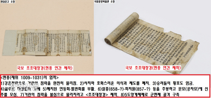 성종 때 폐지된 연등회·팔관회를 부활시키고요. 설총(658~?)·최치원(857~?) 등을 추봉하고 문묘(공자묘)에 그들의 신주를 모셨습니다. 거란군의 침략을 불심(佛心)으로 물리치려고 초조대장경의 제작에 착수, 6000권의 대부분을 완성했습니다. 1018년(현종 9) 5도양계체제라는 군현제의 골격을 구축했습니다. 중앙집권으로 지방의 민심을 다잡고자 한 겁니다.