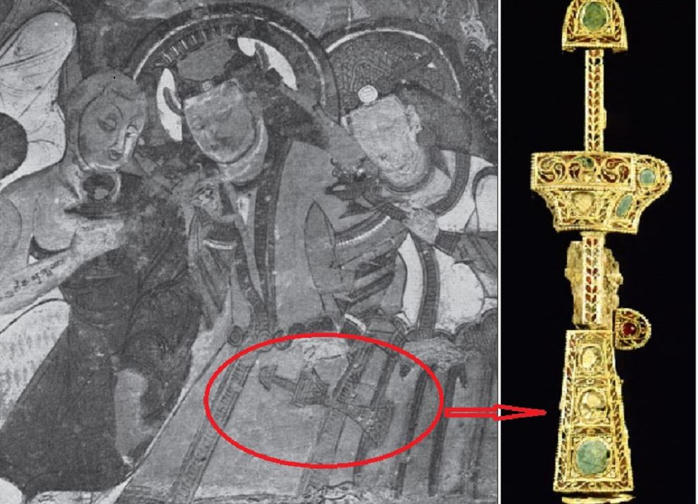 아닌게 아니라 이 황금보검과 매우 유사한 칼의 일부가 1928년 카자흐스탄 보로보에에서 발견된 바 있습니다. 신장 위구르 자치구(新疆維吾爾自治區)의 쿠차(庫車) 키질(克孜이) 석굴벽화 입구 천장에 묘사된 인물의 허리춤 칼도 거의 흡사합니다. 이밖에 우즈베키스탄, 키르기스스탄, 알타이, 투바, 신장 위그르 자치구, 이란 등의 석인상과 유물 등에서도 비슷한 칼이 보입니다.