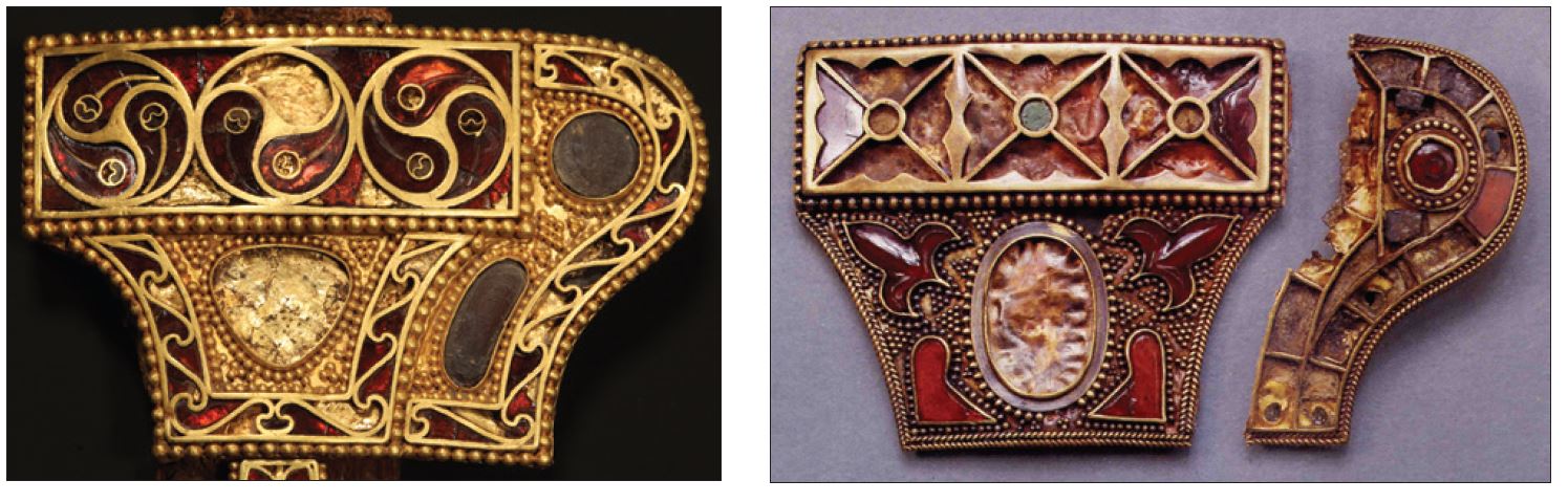 황금과 붉은색 석류석을 사용한 것은 동로마제국에서 기원한 건데요. 이 기법은 훈족의 발흥과 유럽 침략에 따른 민족 대이동 시대에 유럽전역으로 퍼졌답니다. 황금보검의 제작 기법은 동로마제국 또는 동로마제국의 영향을 받은 유럽의 여러 이민족에 의해 제작된 것으로 볼 수 있습니다.
