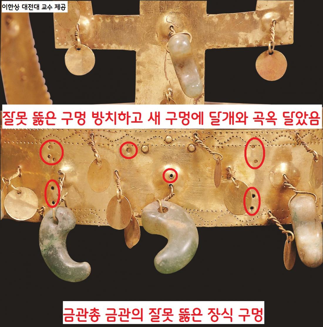가장 먼저(1921) 출토된 국보 ‘금관총 금관’의 관테에는 미리 만든 2줄 구멍은 방치해두고 새롭게 3줄 구멍을 뚫어 곡옥(굽은옥)과 달개를 단 흔적이 보인다.|이한상 대전대 교수 제공