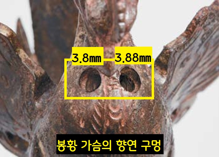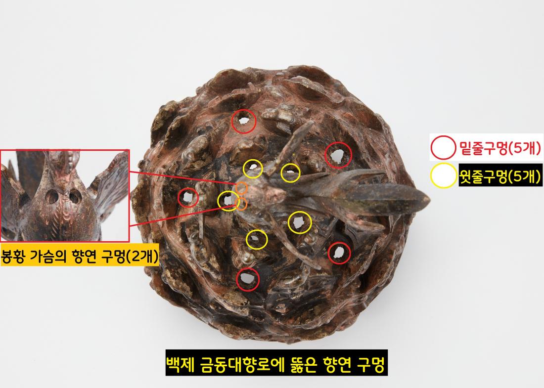 향로의 구멍 12개는 각각 제 역할이 있었다. 아래 구멍 5개가 산소를 공급하는 흡기공이라면 윗부분(5개)과 봉황 앞가슴의 구멍(2개)은 향을 불사르는 배연공이었다.