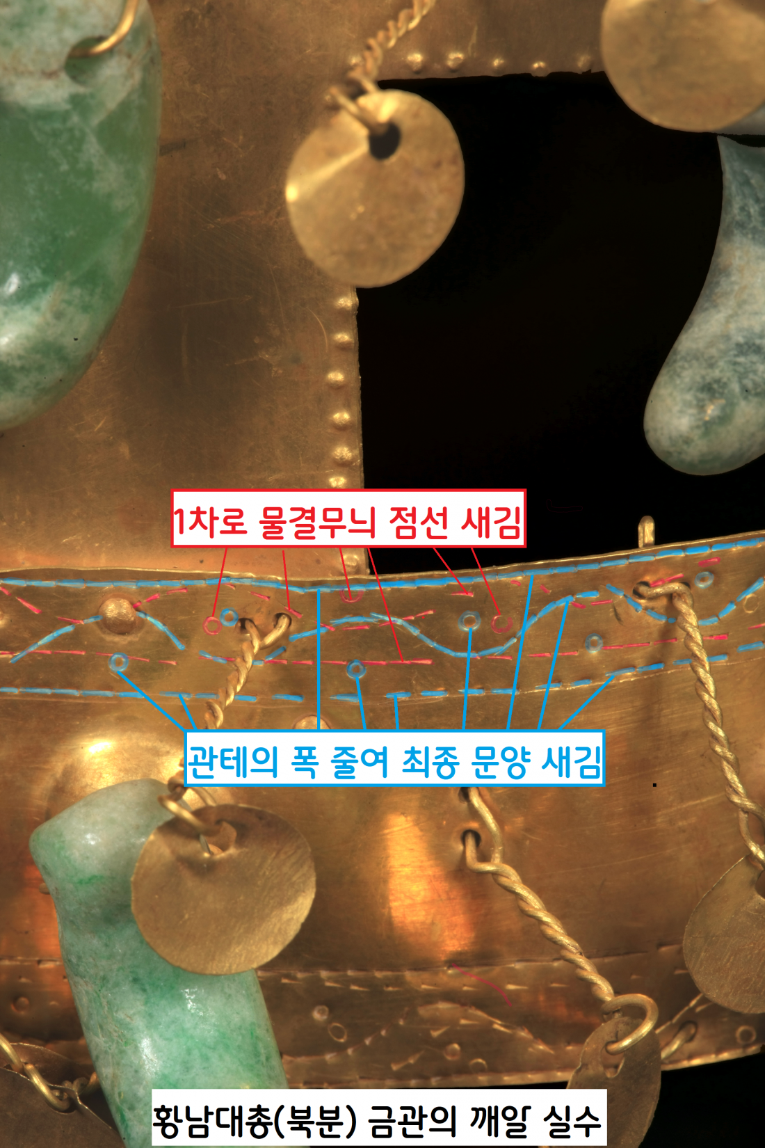 황남대총(북분) 금관(국보)에도 흠결이 보인다. 관테에 새긴 점선 물결무늬의 폭을 줄여 다시 새겼다.|이한상 대전대 교수 제공