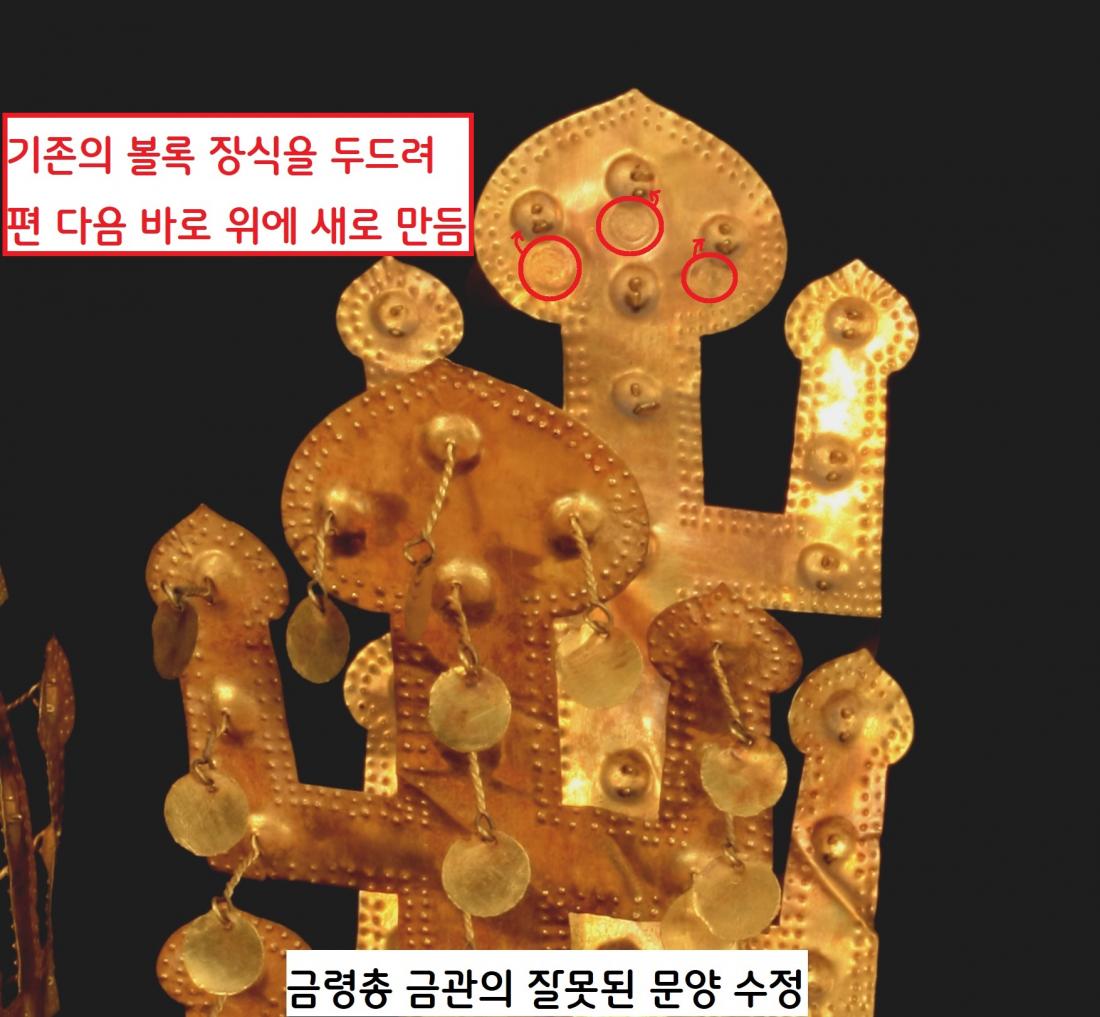 그런데 금관 제작자는 마음이 바뀌었는지, 아니면 단순실수인지는 몰라도 미리 만든 2줄 구멍은 방치해두고 새롭게 3줄 구멍을 뚫어 곡옥과 달개를 달았다. 황남대총(북분) 금관(국보)에도 흠결이 보인다. 관테에 무늬를 잘못 새겨서 지우개로 지우고 다시 만들었다. 금령총 금관(보물)에도 잘못된 문양을 넣었다가 ‘아차!’ 싶었는지 다시 망치 같은 것으로 두드려 새긴 자국이 역력하다.