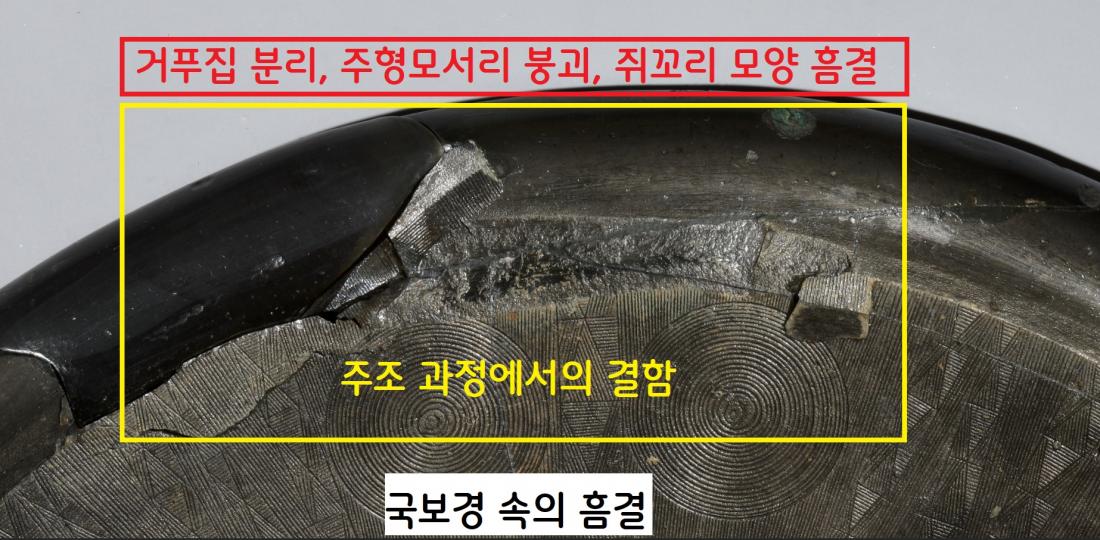 우선 거울 주조 때 거푸집의 주물사에 수분이 너무 많았거나 점토분이 적어서 일어나는 결함이 곳곳에서 확인된다.