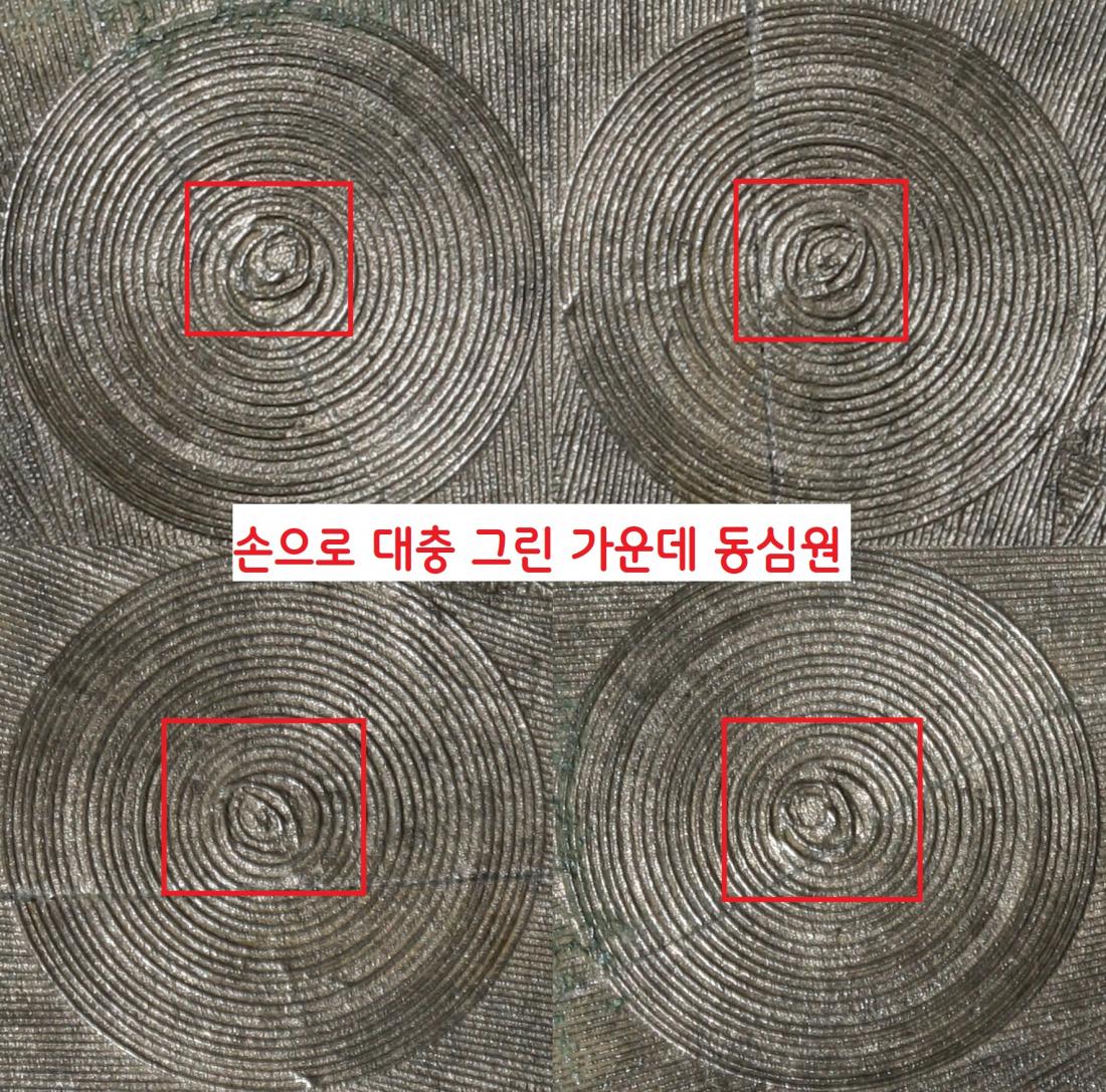 그럴수밖에 없었다. 컴퍼스로 동심원을 그려보라. 한 가운데 동심원은 표시하기 어렵다. 게다가 한가운데엔 컴퍼스를 그릴 때 생기는 자국(원점)이 존재했을 것이다. 아마도 청동기 장인은 그 자국을 주물사로 메우고 그 위에 화룡점정 하듯 마지막 동심원을 손으로 그려넣었을 것이다.