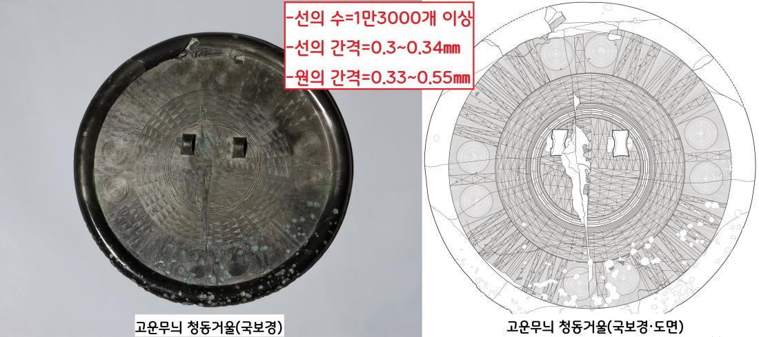흔히 ‘국보경’으로 통하는 이 청동거울에는 반복된 동심원과, 그 동심원 안에 새겨진 무늬, 그리고 직선을 이리저리 규칙적으로 새긴 삼각문양 등이 정밀하게 그려져 있다. 확대경을 들이대고 세어본 선만 1만3000개가 넘는다. 선의 간격은 0.3~0.34㎜, 원의 간격은 0.33~0.55㎜에 불과하다. 그러나 그렇게 정교하고 완벽한 ‘국보경’에서도 몇가지 흠결이 발견된다.