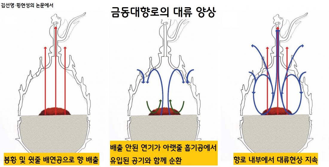 금동대향로 향불 실험결과 향로 내부의 대류 현상도 읽을 수 있었다. 즉 향이 연소되면서 연기가 올라가 봉황(구멍 2개)과 윗줄 배연공(5개)으로 배출된다. 배출되지 않는 나머지 연기는 아래로 내려온다. 이때 아랫줄 흡기공에서 바깥 공기가 유입된다. 들어온 공기와 함께 연기가 향로 내부에서 순환한다. 열을 받은 공기가 다시 위로 솟으며 내부 순환을 계속한다.|김선영·황현성의 논문에서