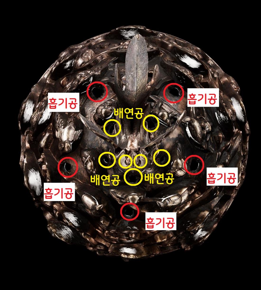 이 대목에서 설명이 필요한 부분이 있다. 아랫줄 구멍 5개가 공기(산소)를 공급하는 흡기공이라면 봉황 가슴 구멍(2개)과 윗줄 구멍 5개는 어떤 역할을 하는가. 그리고 그 7개 중 왜 3개만 확장해놓았을까.
