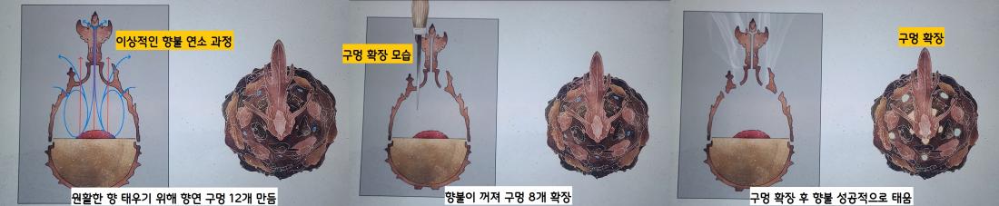 그랬더니 연기(향)가 꺼졌다. 향불은 윗줄 구멍의 확장 여부와는 상관없이 꺼졌다. 무엇을 말해주는가. 향로의 아랫 구멍(5개)이 산소를 공급하는 흡입구 역할을 한다는 사실을 일러준다. 산소가 제대로 공급되지 않으면 불이 꺼지는 원리와 같다. 이러한 분향 실험을 토대로 1350여 년 전 향로 제작 당시의 상황을 복원해볼 수 있다.