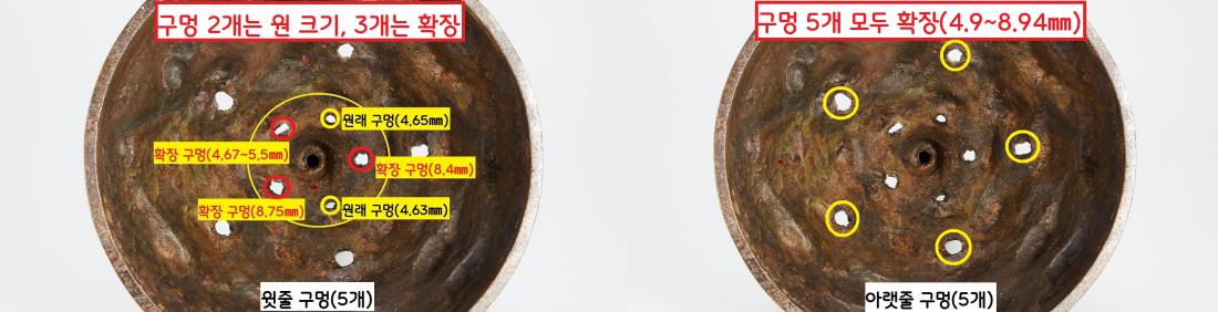아랫줄 구멍(5개)은 어떨까. 4.9~8.94㎜ 정도로 측정되었다. 이 5개의 구멍 역시 원래는 작은 크기로 뚫었지만 제작과정에서 확장했음을 알 수 있었다. 정리하자면 향연 구멍 12개 중 4개는 원래 크기였고, 나머지 8개는 확장했음을 알 수 있다.