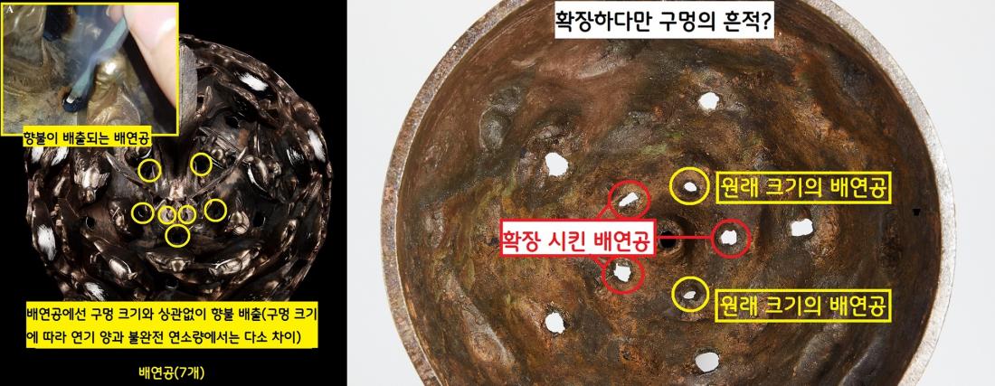 향로의 구멍 12개는 각각 제 역할이 있었다. 아래 구멍 5개가 산소를 공급하는 흡기공이라면 윗부분(5개)과 봉황 앞가슴의 구멍(2개)은 향을 불사르는 배연공이었다.