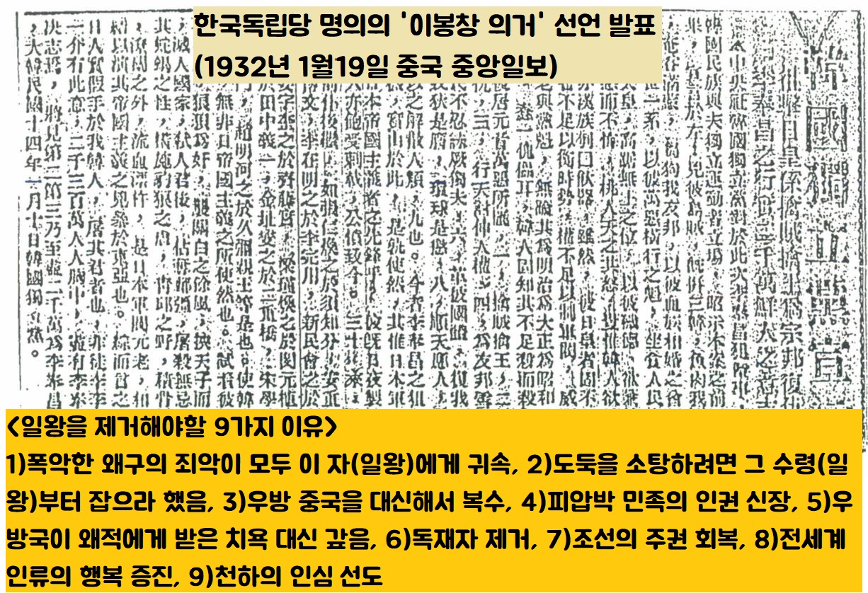 백범은 한국독립당 명의로 이봉창 의거의 정당성, 즉 일왕을 처단해야 하는 9가지 이유를 밝히는 선언문을 중국 언론에 배포합니다. 안중근 의사가 설파한 ‘이토 히로부미의 15대 죄상’을 연상케하는 가슴 후련한 선언문입니다.