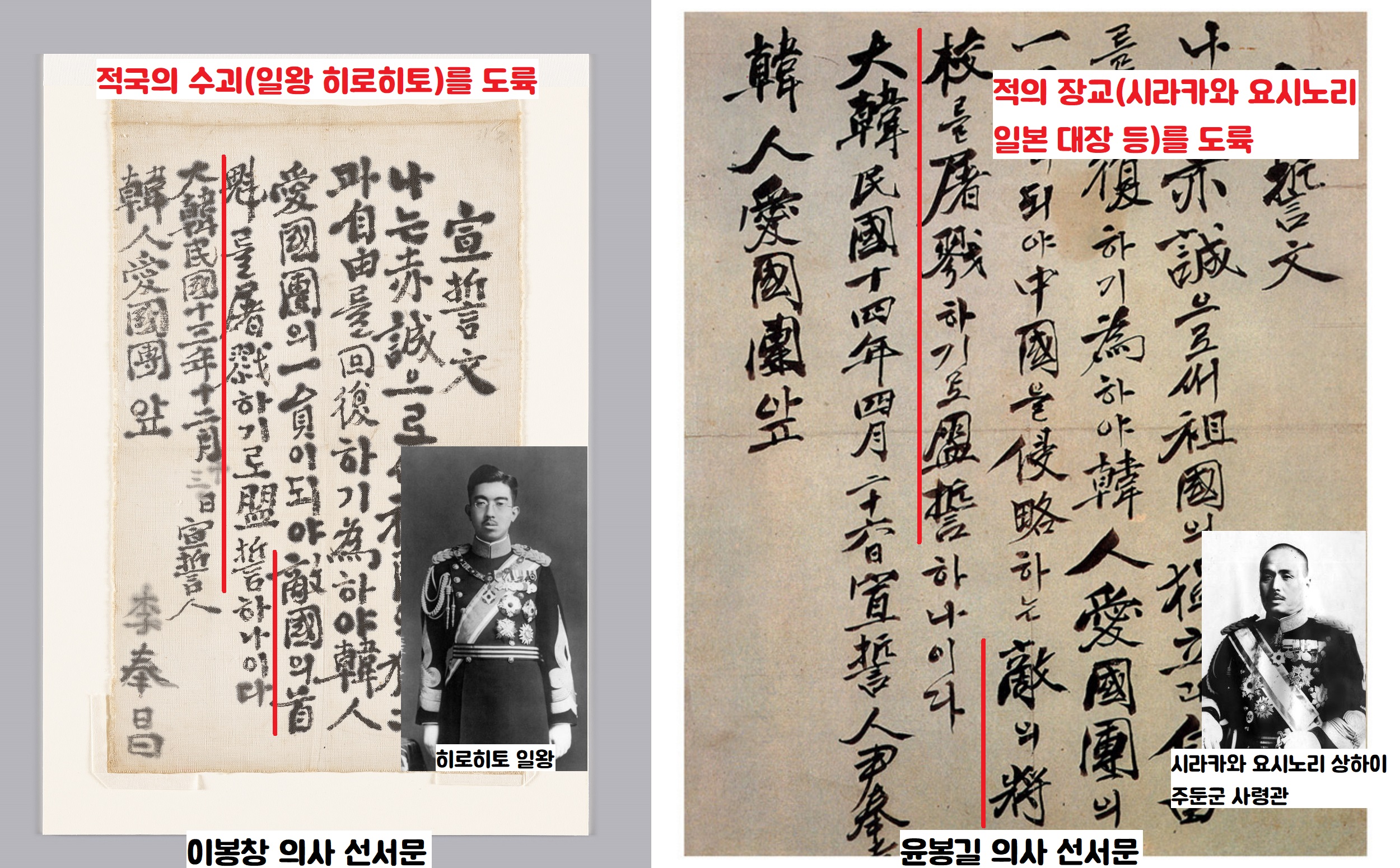 이봉창 의사(1901~1932)는 ‘적국의 수괴(일왕)’, 윤봉길 의사는 ‘적의 장교(시라카와 요시노리·白川義則 일본 상하이 주둔군 사령관)’ 등 도륙의 대상을 분명히 했습니다.