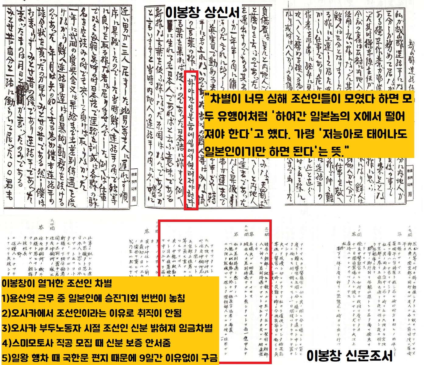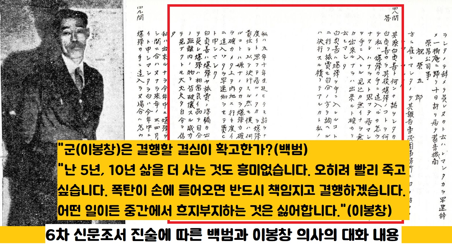 “일본인은 조선인을 차별 대우하고 학대하고 있다. 조선인은 어떻게든 조선을 독립시켜 조선인의 국가를 갖지 않으면 안된다…결코 이봉창 한사람이 멋대로 벌인 난폭한 행동이 아니다. 조선민족을 대표해서…결행한 것이다.”