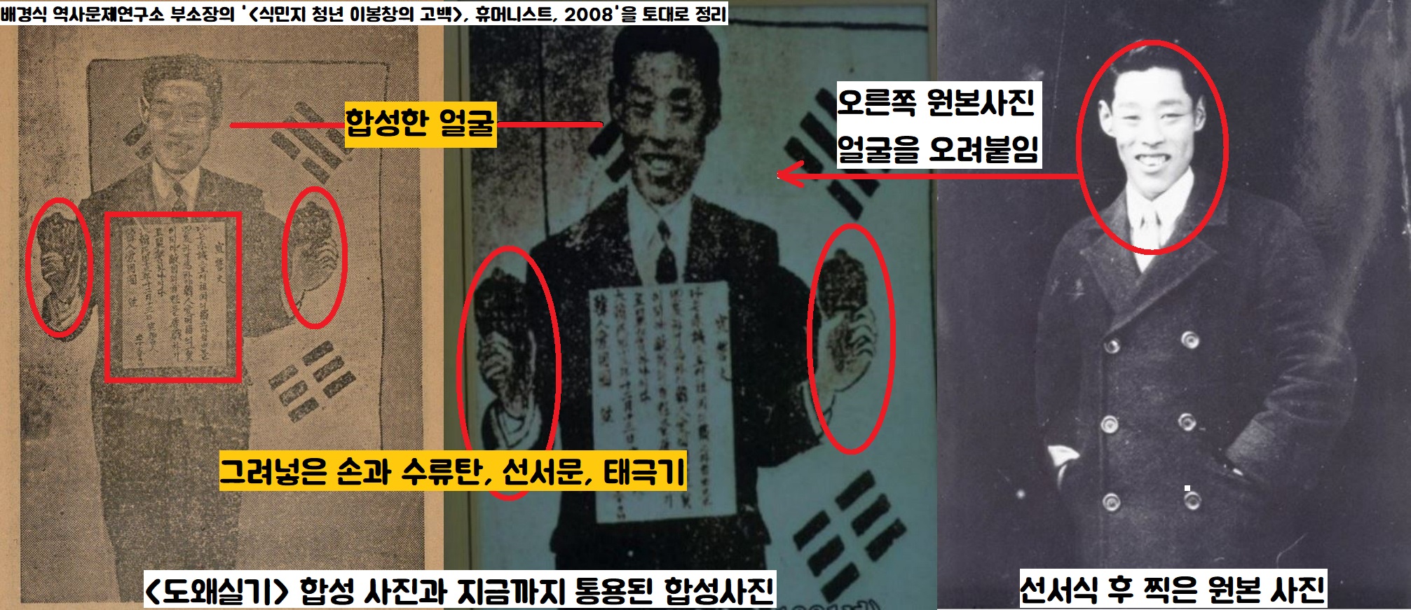 자세히 보면 정말 수류탄을 든 양 손과, 배경 속 태극기는 ‘그려넣었다’는 것을 쉽게 알 수 있습니다. 목에 건 선서문도, 얼굴의 목선도 어색하기 이를데 없죠.(배경식 부소장) 거사를 더욱 극적으로 묘사하기 위해 사진에 손을 좀 본 거겠지요.