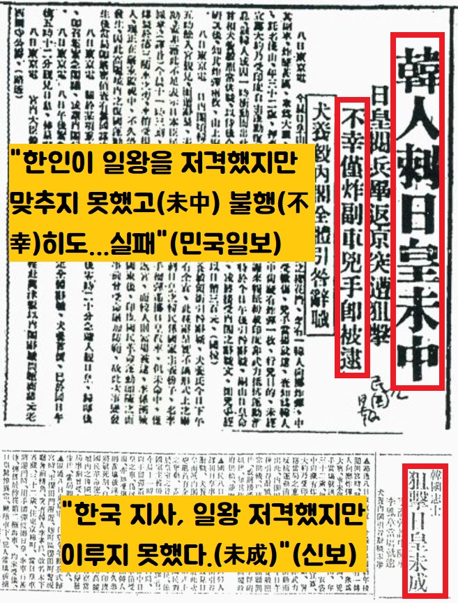 국민당 기관지인 ‘민국일보’는 더욱 적극적인 표현을 사용했죠. ‘한인이 일왕을 저격했지만 맞추지 못했다(韓人刺日皇未中)’면서 ‘불행(不幸)히도 뒤따라오던 마차를 맞추는 바람에 실패로 끝나고 체포됐다(不幸僅炸副車兇手卽被逮)’고 했습니다. 이것이 유명한 ‘불행 미중(不幸未中·불행하게도 일왕을 맞추지 못했다)’의 논조입니다.