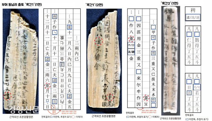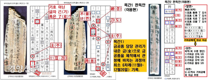 당시 보도자료를 볼까요. ‘목간1’에서는 ‘날짜(12월10일)’와 ‘금(金)’자, 중량 단위를 뜻하는 ‘주(主)’자가 파악됐습니다.