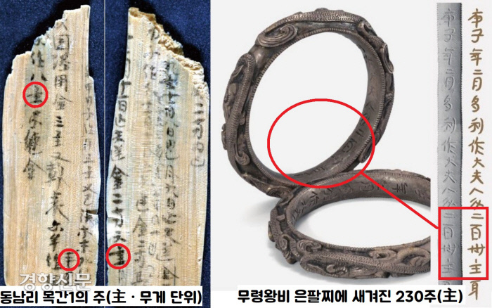 ‘주(主)’와 관련해서는 1971년 무령왕릉 출토 은제팔찌에서도 ‘230주(主)’라는 중량 표시가 새겨져 있습니다.
