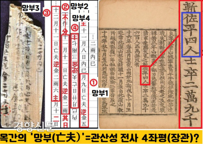 <삼국사기> ‘백제본기·성왕’조는 “554년 성왕이 관산성을 공격하다가 신라군에 의해 전사했다. 좌평(장관) 4명과 연합군 2만9600명이 죽었다”고 했죠. 이 대목입니다. 좌평 4명…. 동남리 목간의 ‘망부’ 4명이 관산성 전투에서 전사한 ‘좌평 4명’일 가능성을 제기한 겁니다. 물론 100% 맞냐고 하면 할 말은 없습니다. 어느 사료에도 정답이 나와있지 않으니까요.