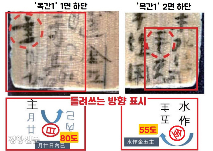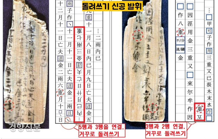 이 명문 목간에는 대중의 시선을 끌 ‘아이템’이 하나 더 있었습니다. 보도자료는 “세로로 쓴 문서 행간의 빈 공간에 이음표(′)를 표시한 뒤 그 다음 줄에는 글자를 180도 돌려 거꾸로 써내려갔다”고 설명했습니다.